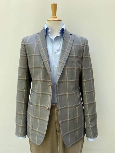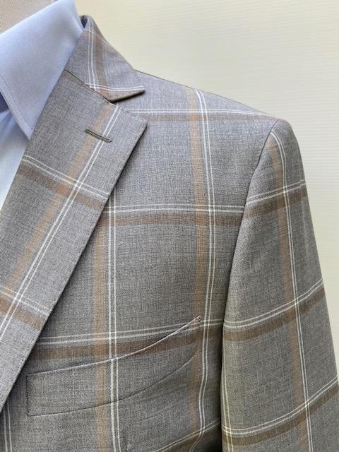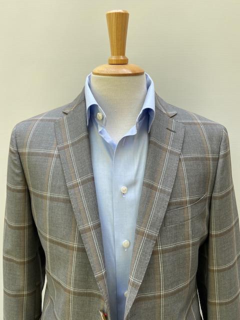 Colbert met grote overruit in neutale grijs-beige tinten.