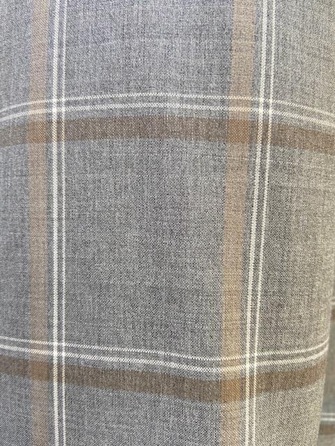 Maak een afspraakColbert met grote overruit in neutale grijs-beige tinten.