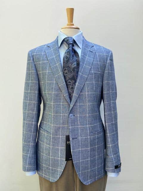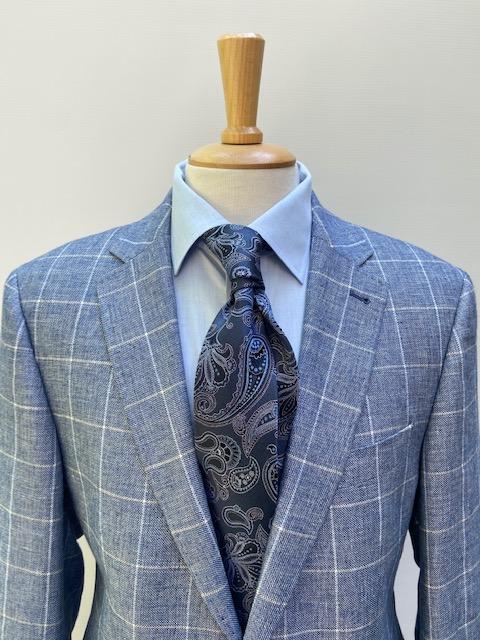 Mooi Jasje in een heerlijke Linne / Wol menging. Soft linnen, waardoor een hoog draagcomfort gegarandeerd is en weinig kreukt. Lichtblauw met overruit.