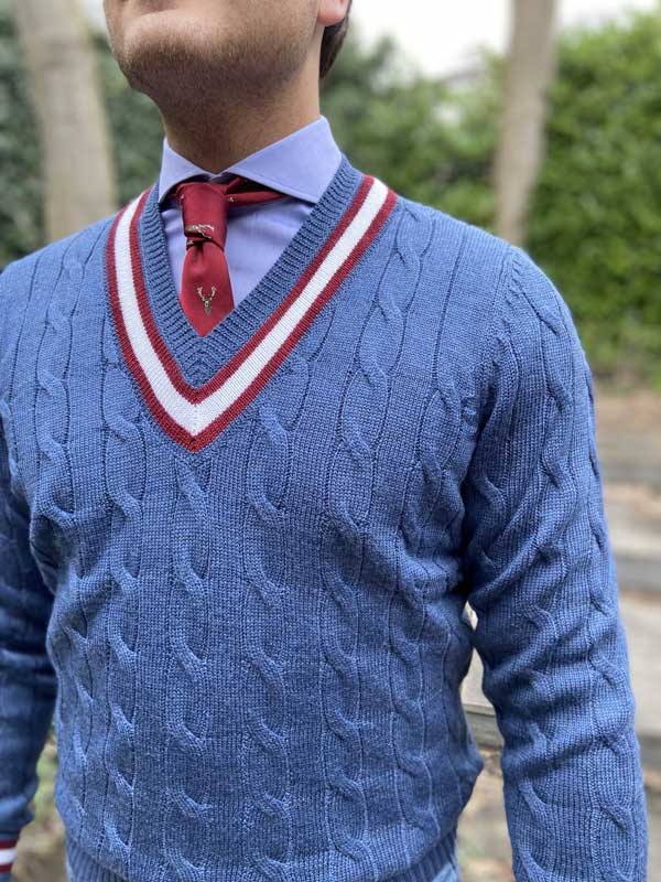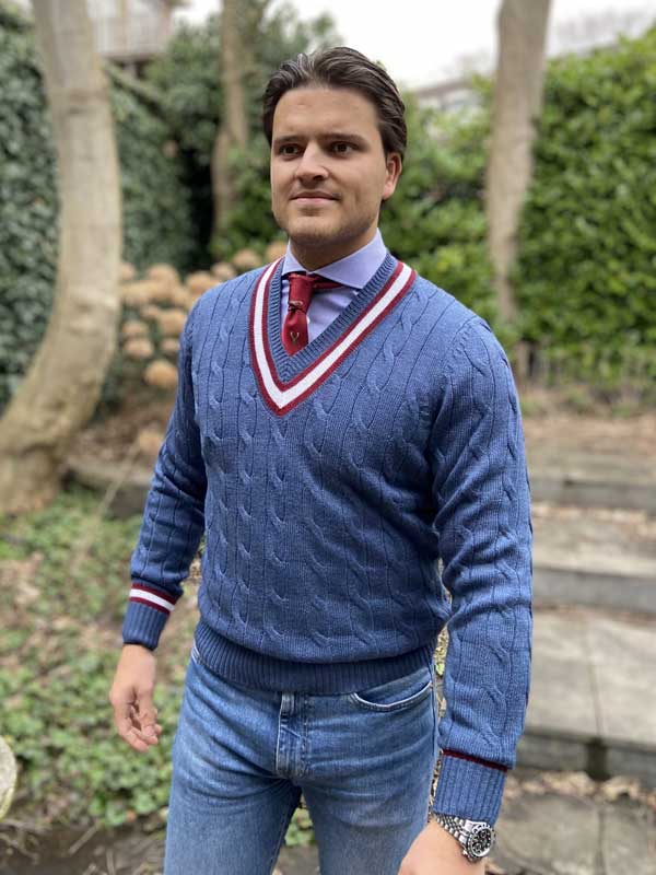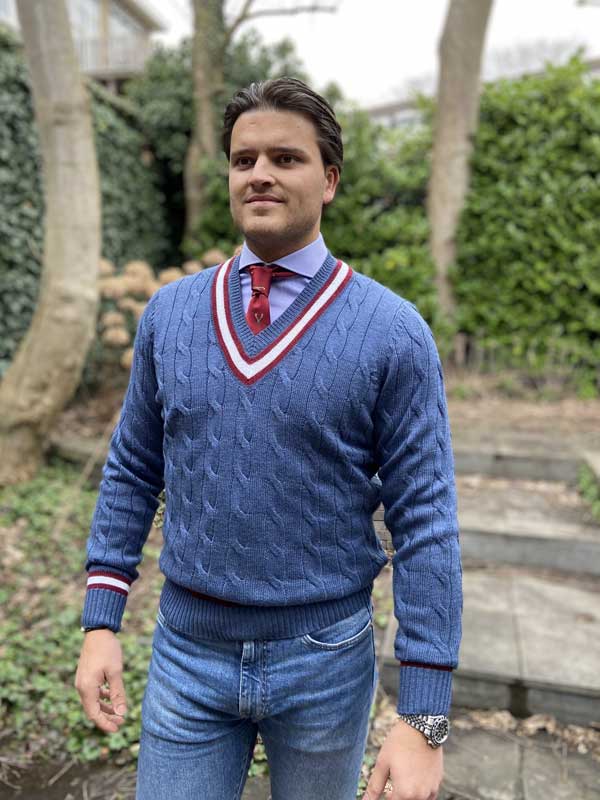 Knitted in fine merino wool, our Black Grape vee neck cricket jumper is a contemporary take on the traditional style. Featuring a sophisticated cable design, we’ve added a striking trim around the vee, cuffs and the welt.