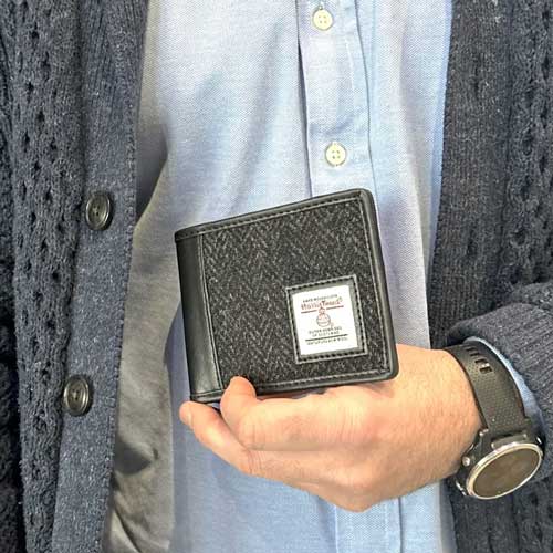 De minimalistische Harris Tweed portemonnee heeft 6 kaartsleuven, een muntvak en 2 vakken voor briefjes. Onze veelzijdige Harris Tweed portemonnee voegt een vleugje luxe toe aan uw dagelijkse outfit.