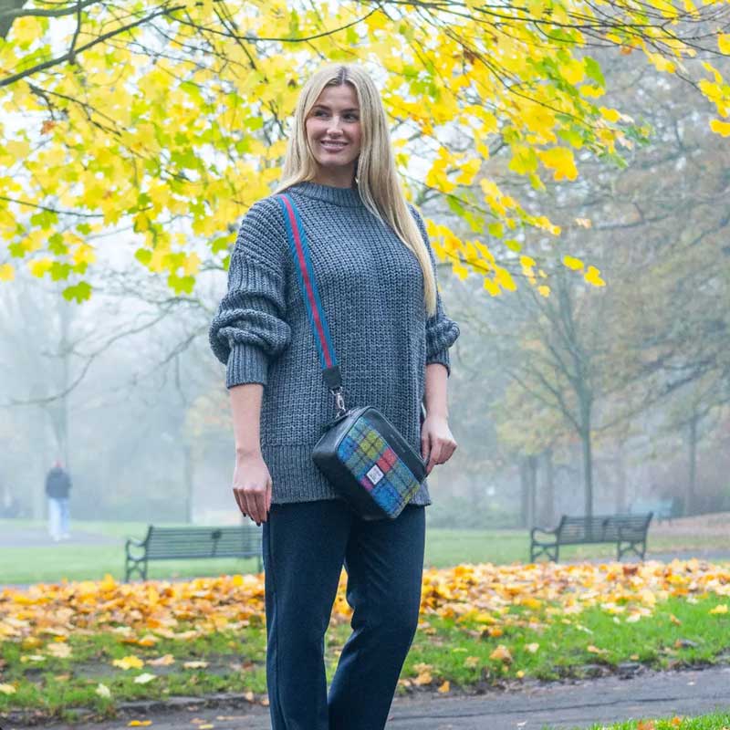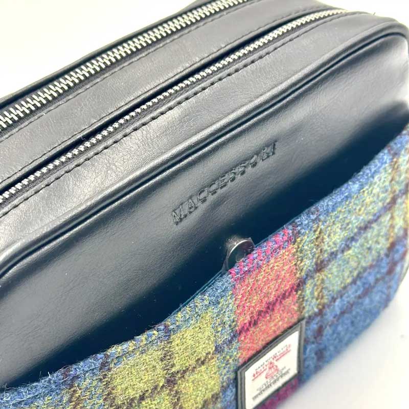 Deze Harris Tweed cameratas is ontworpen met twee interne ritsvakken voor al je essentiële spullen, een extern ritsvak en een open vak met een magnetische sluiting.