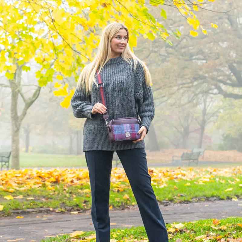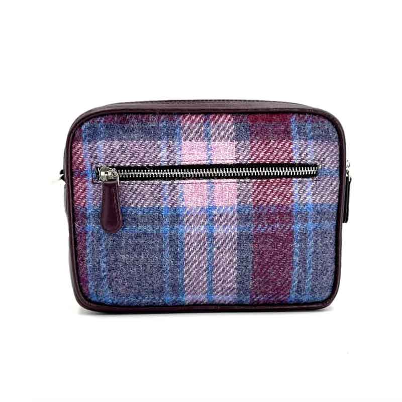 Deze Harris Tweed cameratas is ontworpen met twee interne ritsvakken voor al je essentiële spullen, een extern ritsvak en een open vak met een magnetische sluiting.