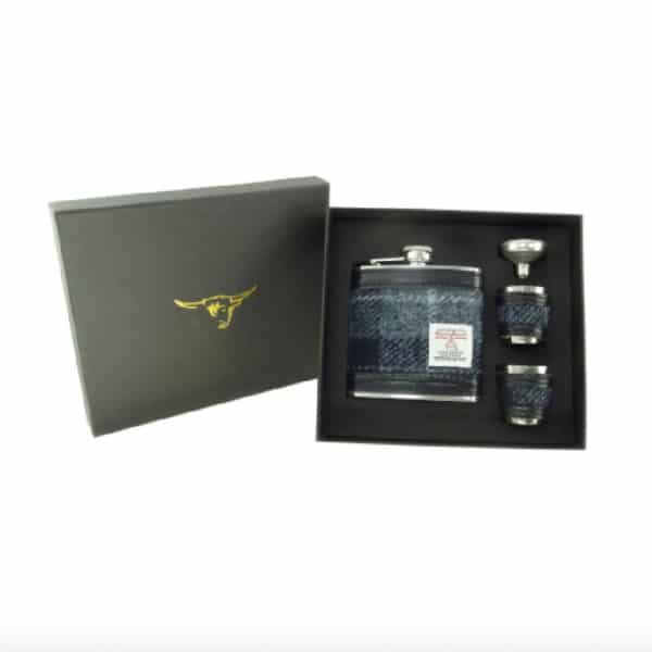 Home » Winkel » Gifts » Harris Tweed Hip Flask Gift Set in Grey/Black Tartan