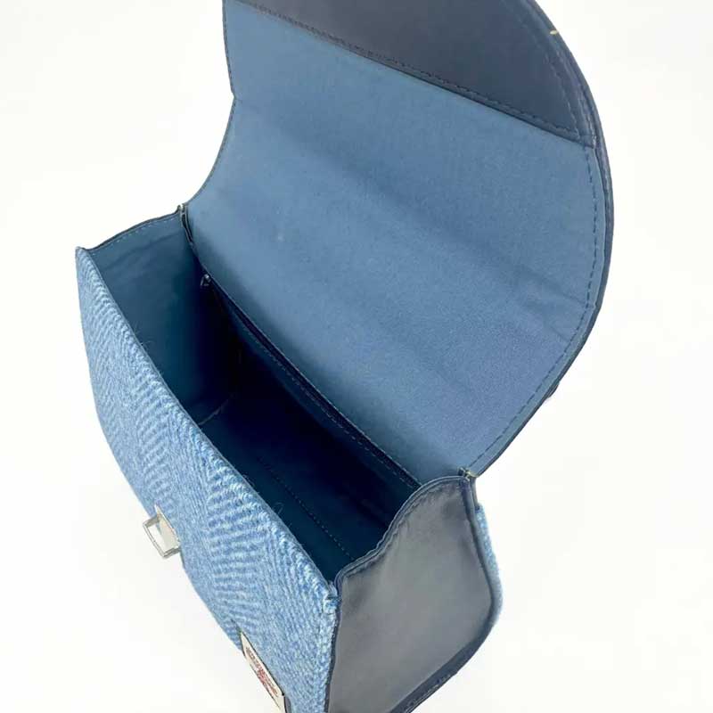 Harris Tweed Mini Day Bag In Sky Blue. Onze Harris Tweed damestas is een van de meest elegante tassen die we ooit hebben ontworpen. Deze moeiteloos chique minitas is ontworpen om uw dagelijkse look naar een hoger niveau te tillen.