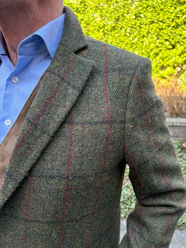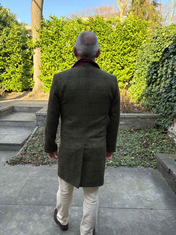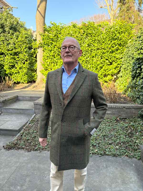 Harris Tweed Overjas Barney Green Overcheck. Een perfect voorbeeld van een moderne wollen jas met reverskraag, gecombineerd met een tweed die al tientallen jaren zijn waarde heeft bewezen.