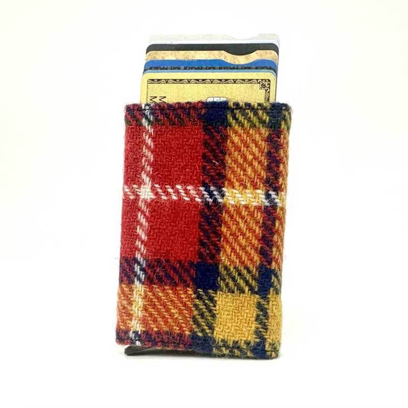Onze Harris Tweed pop-up kaarthouder spreidt uw pasjes uit met één druk op de knop en beschermt ze tegen RFID-skimming dankzij de aluminium behuizing.