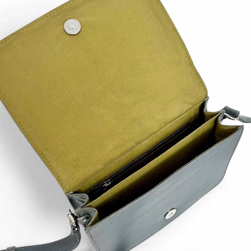 Deze schoudertas is gemaakt van Harris Tweed, heeft een doorgestikte klep en een open vak aan de achterkant, evenals een veilig ritsvak aan de binnenkant.