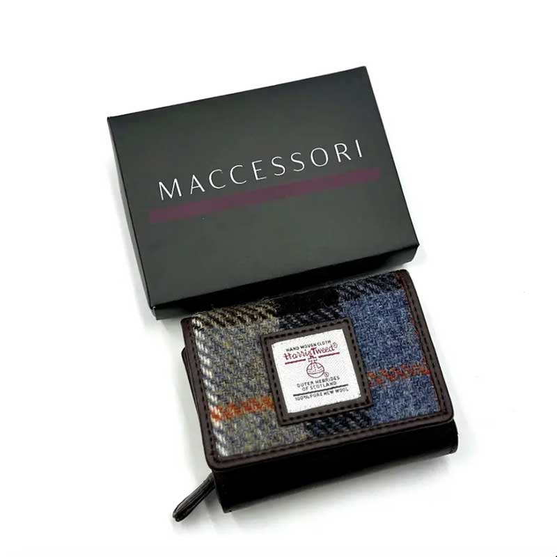 Harris Tweed Trifold Purse In Blue/Brown Check