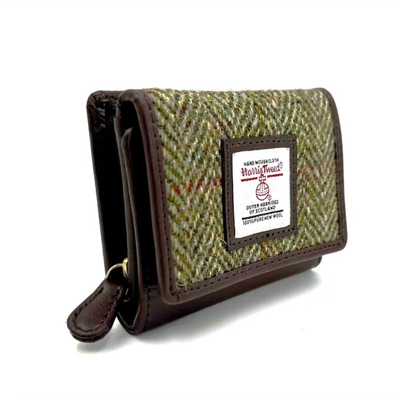 Onze trifold purse is verkrijgbaar in negen Harris Tweed-kleuren. De afwerking van het veganistisch leer verschilt afhankelijk van de gekozen Harris Tweed-kleur: