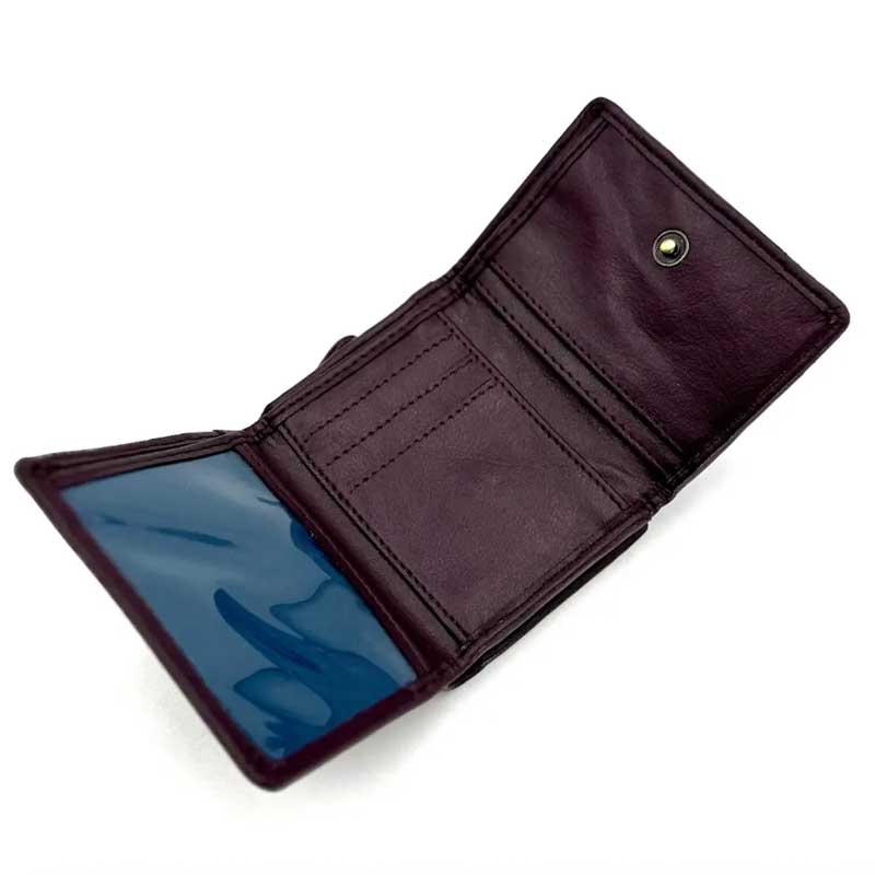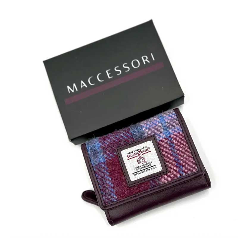 Onze trifold purse is verkrijgbaar in negen Harris Tweed-kleuren. De afwerking van het veganistisch leer verschilt afhankelijk van de gekozen Harris Tweed-kleur: