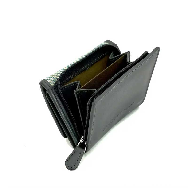 Onze trifold purse is verkrijgbaar in negen Harris Tweed-kleuren. De afwerking van het veganistisch leer verschilt afhankelijk van de gekozen Harris Tweed-kleur: