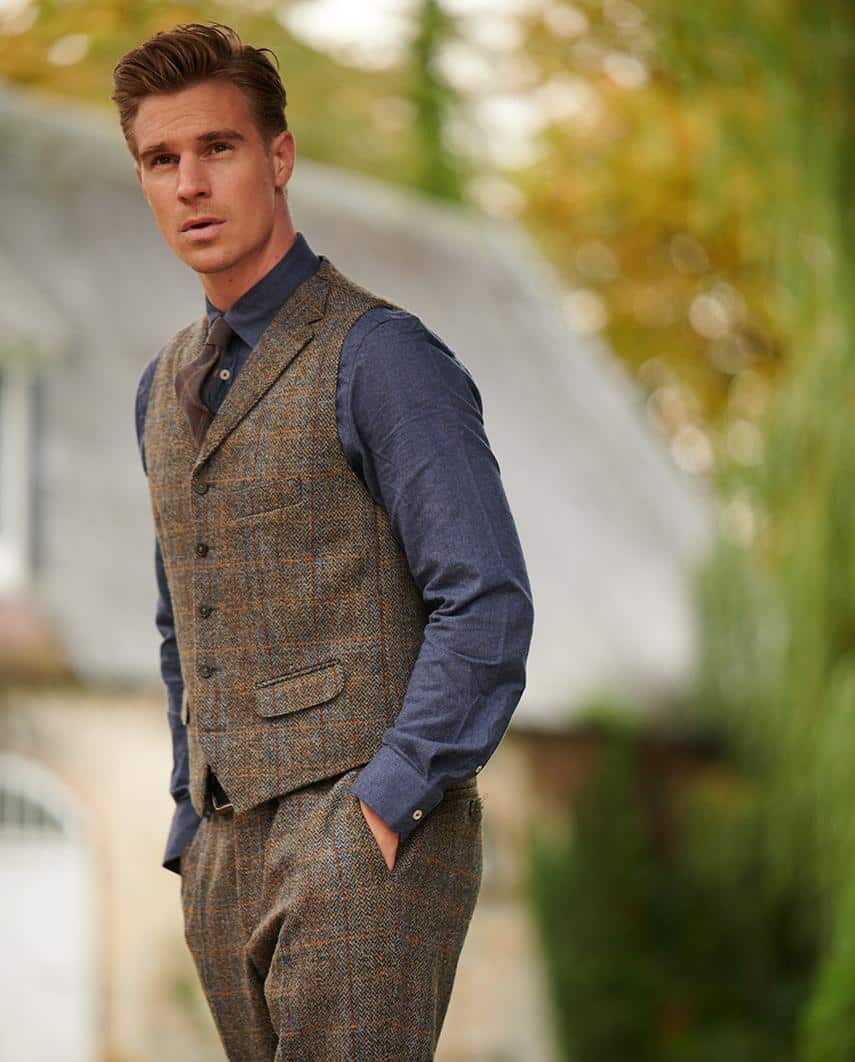 Harris Tweed “Wales” gilet – voor mannen met stijl, verfijning en gevoel voor traditie.