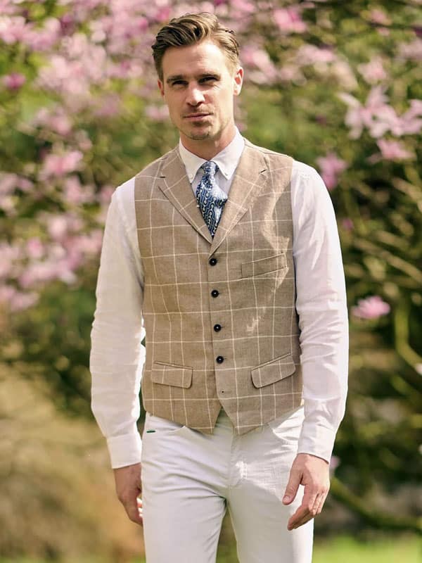 Home » Winkel » Vestjes en Gilets » Heren vestjes » Linnen Vestje Wales Met Revers In The Beige Window Check