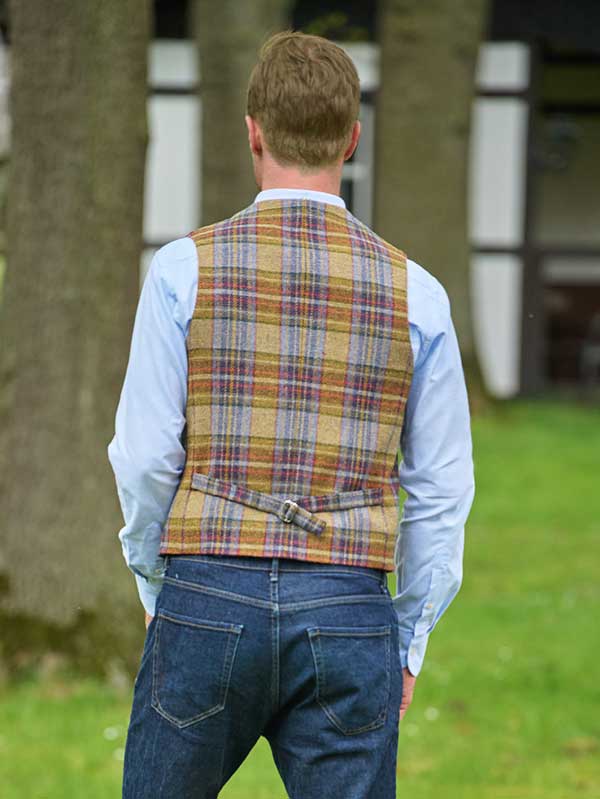 Klassiek herenvest “Wales”, gemaakt van 100% Magee Tweed in een prachtig veelkleurig ruitpatroon. Magee, een 150 jaar oud traditioneel Iers bedrijf, staat bekend om zijn luxueuze kwaliteit en uitzonderlijk comfort. Het merk is beroemd om zijn levendige patronen, geïnspireerd op het pittoreske landschap van County Donegal. Dit traditioneel vervaardigde vest met vijf knopen heeft een licht getailleerde pasvorm met revers. Het is voorzien van twee klepzakken, een paspelzak op de borst, een achterpand van dezelfde stof en een verstelbare band. Het ingenaaide certificaat van echtheid garandeert de unieke kwaliteit en authenticiteit van de stof. Klassiek, tijdloos en toch modern: dit vest zorgt altijd voor een stijlvolle uitstraling en kan perfect gecombineerd worden met blazers, casual jeans, chino’s of klassieke corduroy broeken.