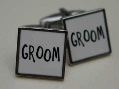 Prachtige manchetknopen met de tekst ‘Groom’ erop, perfect om te dragen bij uw hemd met dubbele manchet. Onder bijvoorbeeld uw smoking.