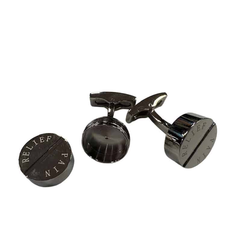 Prachtige manchetknopen met de tekst Relief-Pain, perfect om te dragen bij uw smokinghemd met dubbele manchet.