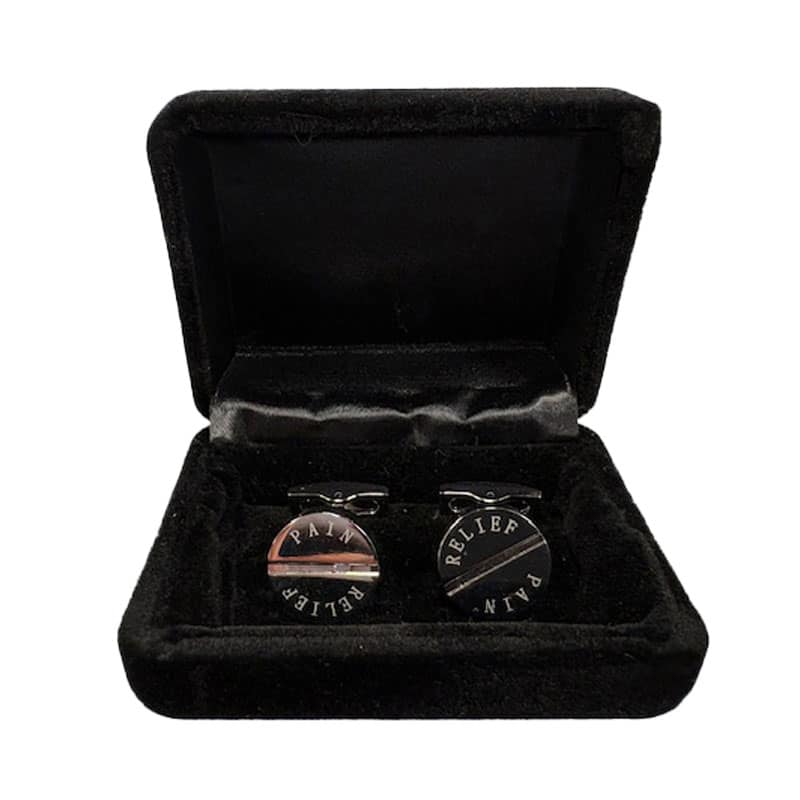 Maak een afspraakPrachtige manchetknopen met de tekst Relief-Pain, perfect om te dragen bij uw smokinghemd met dubbele manchet.
