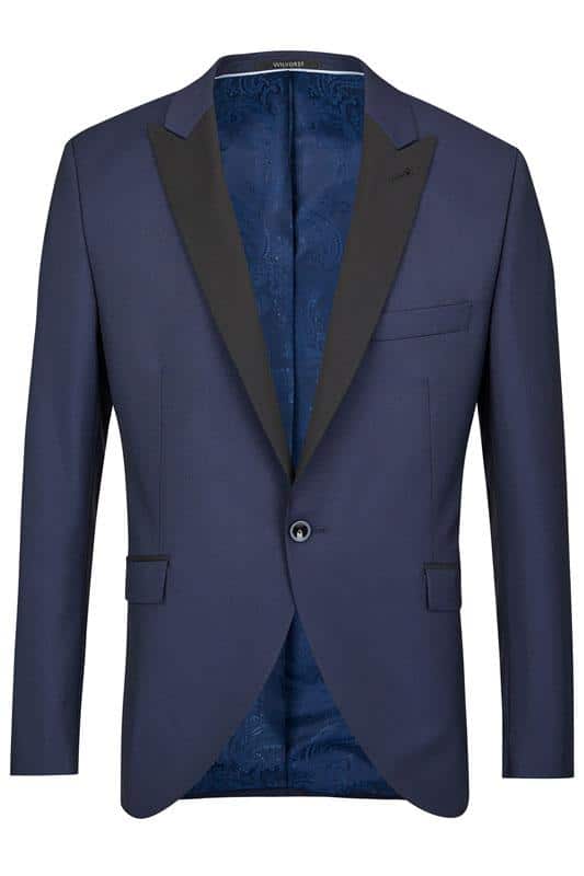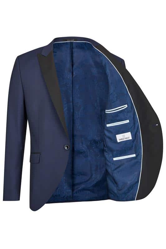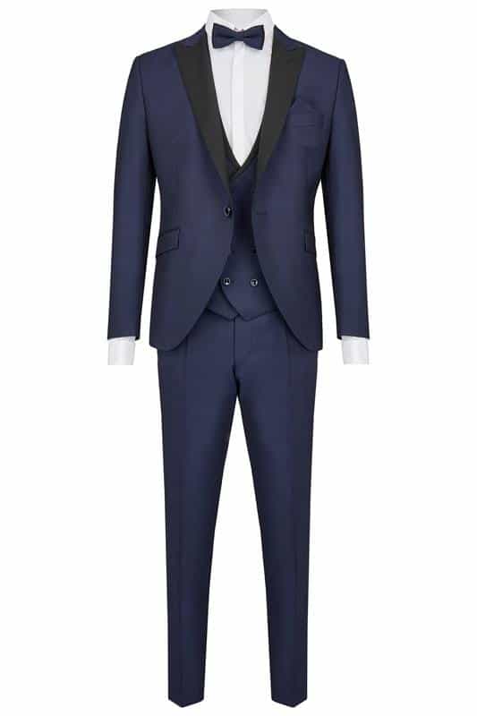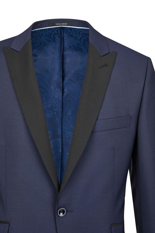 Moderne smoking in een soepele marine blauwe wol-mohair kwaliteit.