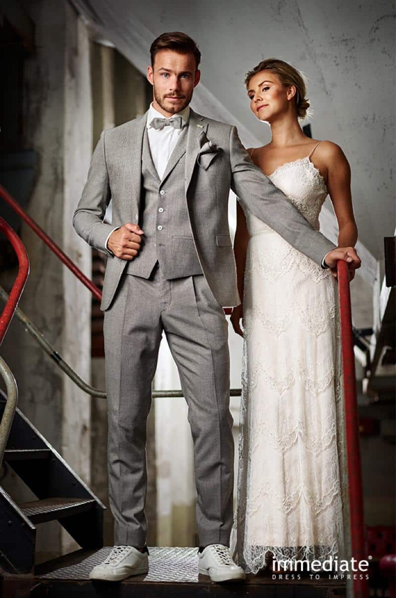Prachtig grijs trouwpak met bijbehorend vestje uit de nieuwe collectie van Immediate. Immediate is een prachtig trouwpakken merk met Italiaanse designs van Nederlandse bodem. Door gebruik van enorm luxe stoffen en uitgekiende designs is een collectie ontwikkeld die werkelijk ongeevenaard is. Wij nodigen u uit om vrijblijvend eens een afspraak te maken of loop eens gewoon bij ons binnen om deze prachtige collectie te zien!