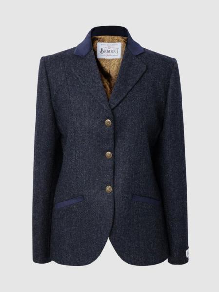 Velours Colbert London Olive 30. Fijne details, zoals de met wolvilt gevoerde kraag en elegante knopen met hoorneffect, geven de blazer zijn kenmerkende verfijning.
