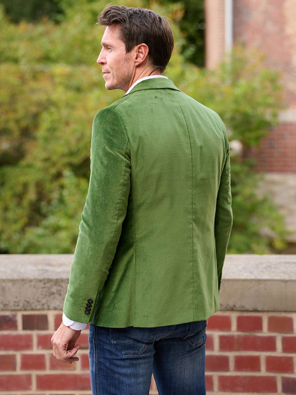 Velours Colbert London Olive 30. Fijne details, zoals de met wolvilt gevoerde kraag en elegante knopen met hoorneffect, geven de blazer zijn kenmerkende verfijning.