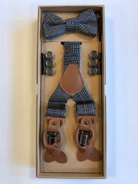 Maak een afspraakVintage bretelset met strik. Bretels met authentieke leertjes. Dubbelsysteem, ook eventueel met clips te dragen. Ook zitten er opzetknopen bij om op uw broeksband te klemmen.