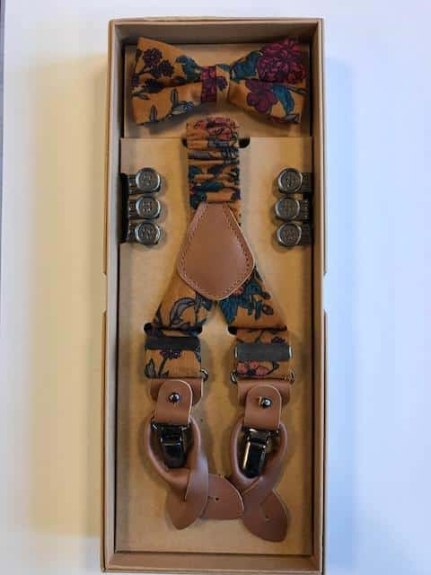 Maak een afspraakVintage bretelset met strik. Bretels met authentieke leertjes. Dubbelsysteem, ook eventueel met clips te dragen. Ook zitten er opzetknopen bij om op uw broeksband te klemmen.