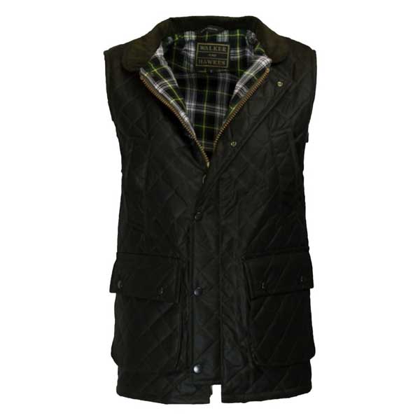 Wax Diamond Quilted Lincoln Gilet Olive. Onze gewatteerde bodywarmer met waxlaag heeft een binnenvoering van 100% geruit katoen. De buitenjas (shell) is gemaakt van zwaar, 100% gewaxt katoen, waardoor dit vest water- en winddicht is. De gewaxte katoenen buitenkant heeft een 3,8 cm (1,5 inch) box-quilting patroon.
