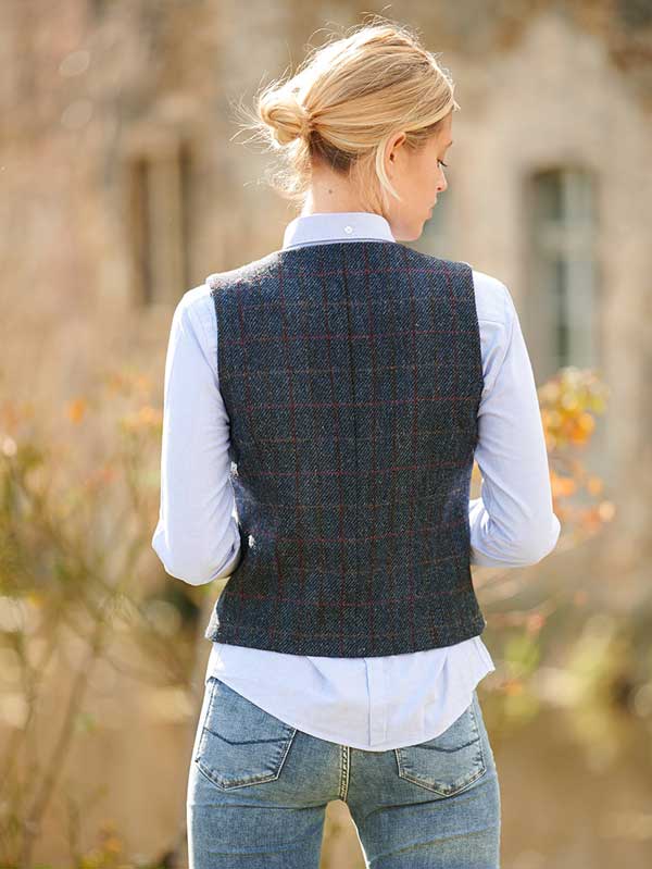 Het vrouwelijke Harris Tweed vest “Lea” combineert op stijlvolle wijze traditie en innovatie. De fijne scheerwol – met de hand geweven op de Schotse Buiten-Hebriden – is veel meer dan alleen een stof: het staat voor meer dan 100 jaar traditie, ongeëvenaarde kwaliteit, bijzonder duurzame productie en is een uiting van de Britse culturele geschiedenis. Harris Tweed is ademend, temperatuurregulerend en daardoor de perfecte metgezel voor elk seizoen.