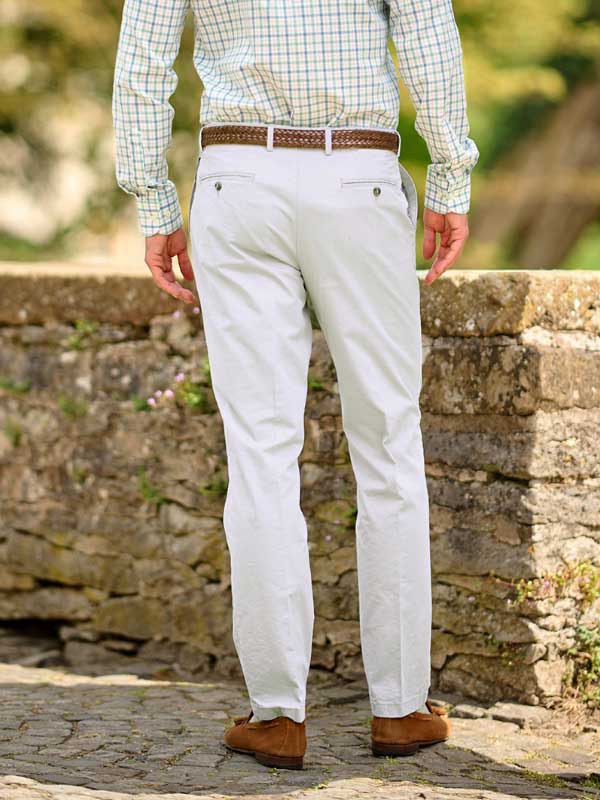 Heren Chino Katoen "Mr. Jones" in White 90. Deze klassiek gesneden herenchino's, "Mr. Jones", zijn gemaakt van premium Pima-katoen – de ideale zomerbroek voor warme dagen.