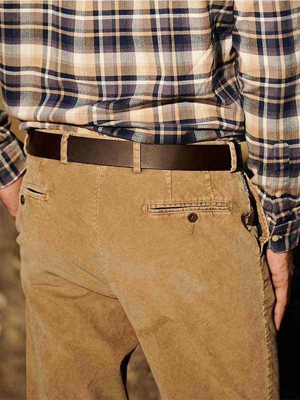 Corduroy Broek "Mr. Bradley" In Beige 29. De corduroy herenbroek "Mr. Bradley", gemaakt van medium-fijne genuaanse ribcorduroy, belichaamt klassieke stijl en uitzonderlijk comfort. Gemaakt van hoogwaardige bi-stretchstof met een hoog katoengehalte en stretchvezels, past de broek zich perfect aan elke beweging aan en behoudt hij zijn vorm.