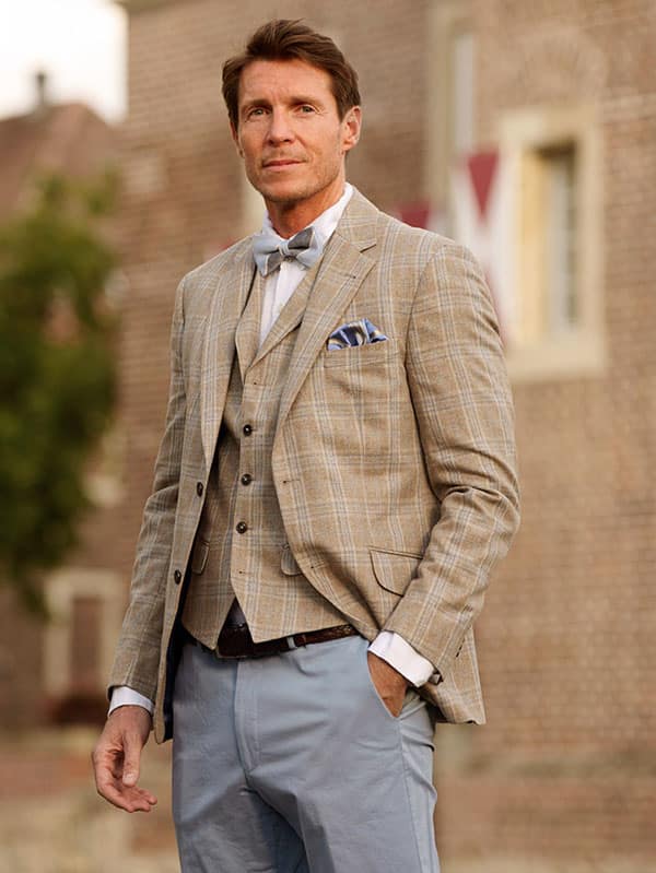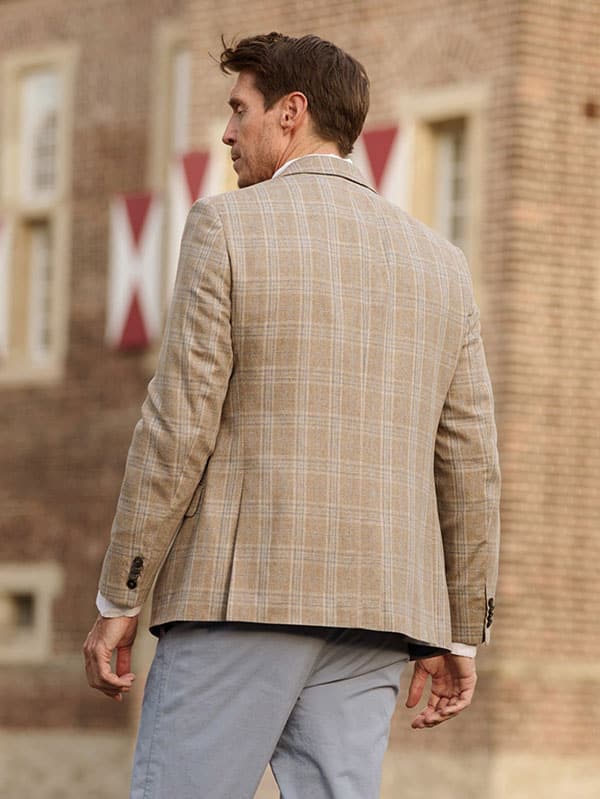 Home » Winkel » Colberts en Jasjes » Colbert Linnen » Zijden Jasje London In Zijden Vestje Wales Met Revers In Beige-Blue Glencheck